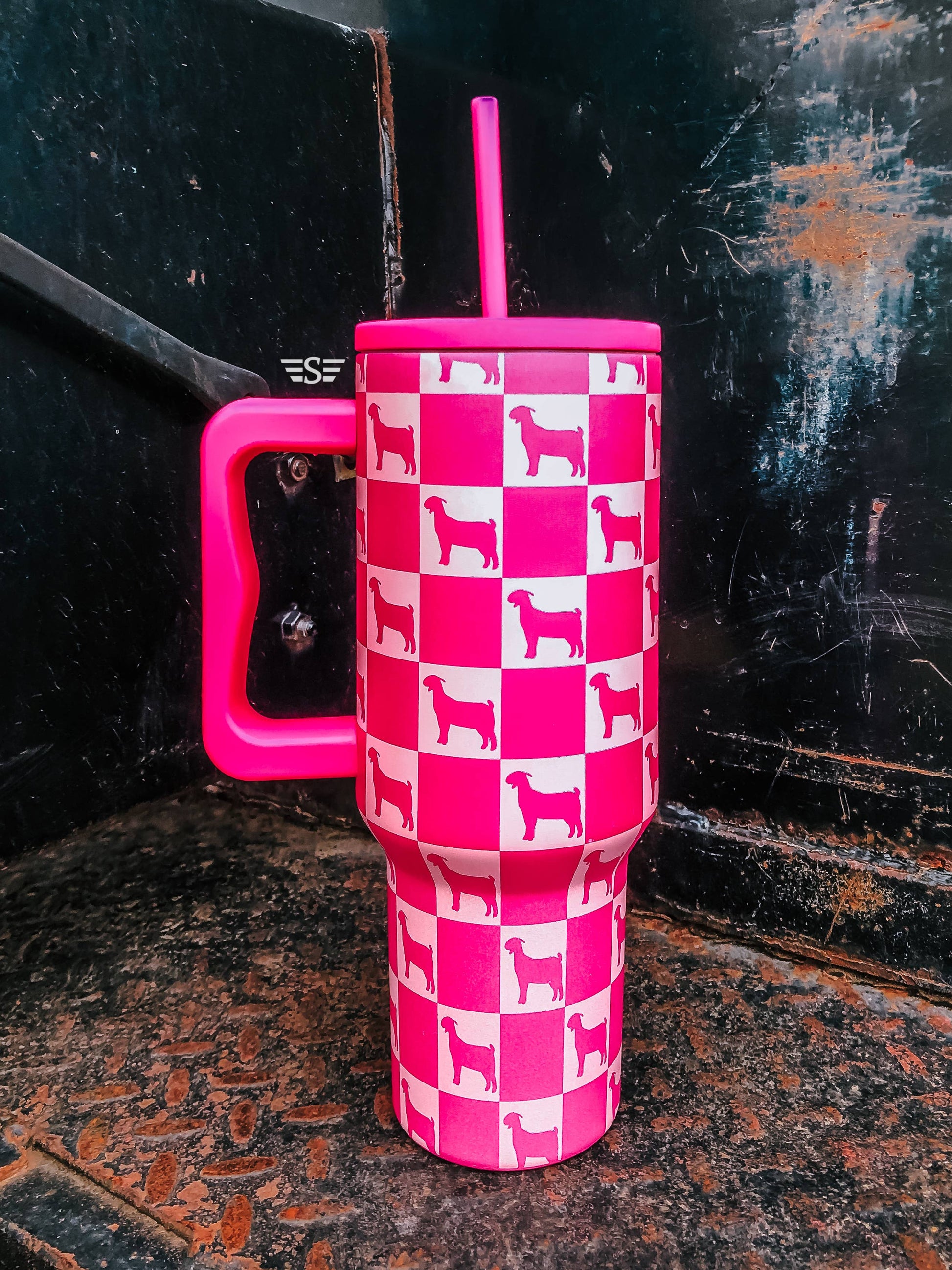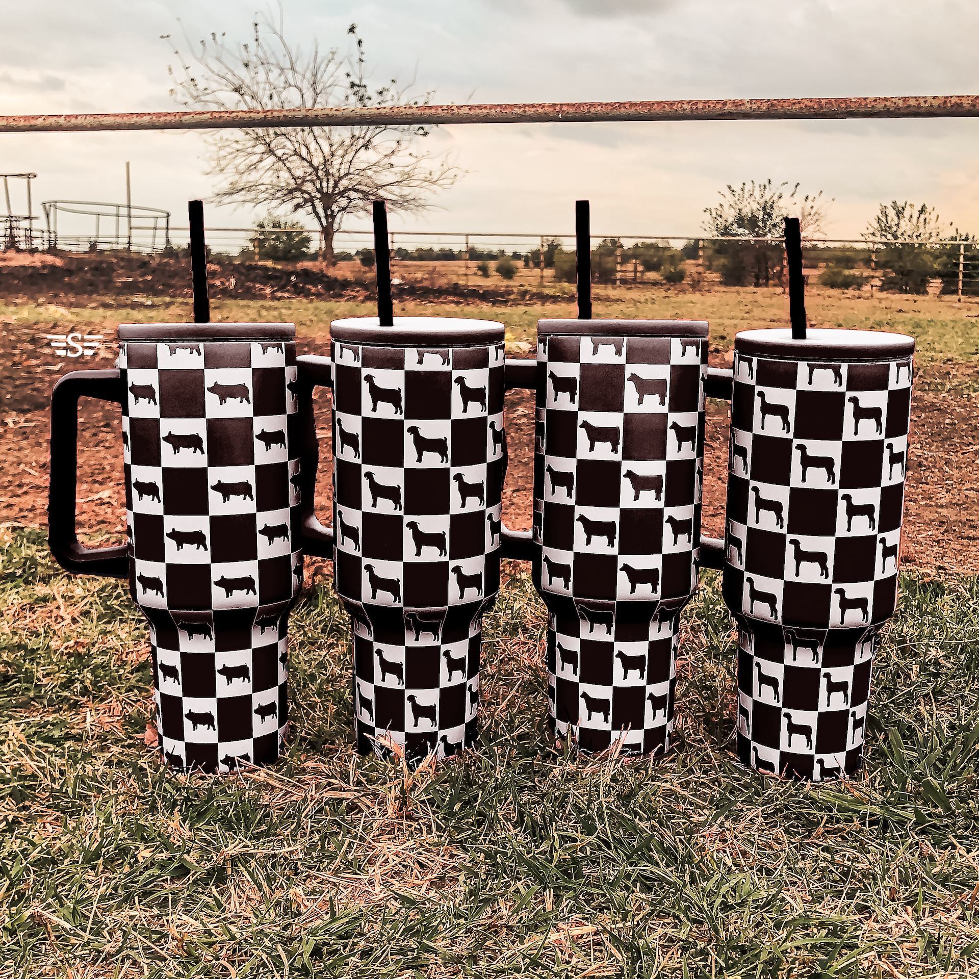 Were obsessed with checks and throwing show animals on there has really made us head over heels for this new design. Available in 4 livestock species! This design is super sleek on our 40z insulated cups! You won't see these cups leaking, these seal up when tightened and are perfect for those on the go! Swap the lid direction for a left or right handed cup! Stainless steel Hard Plastic Straw Rated 6hrs warm and 12hrs cold Sleek design allows for easy cupholder fit