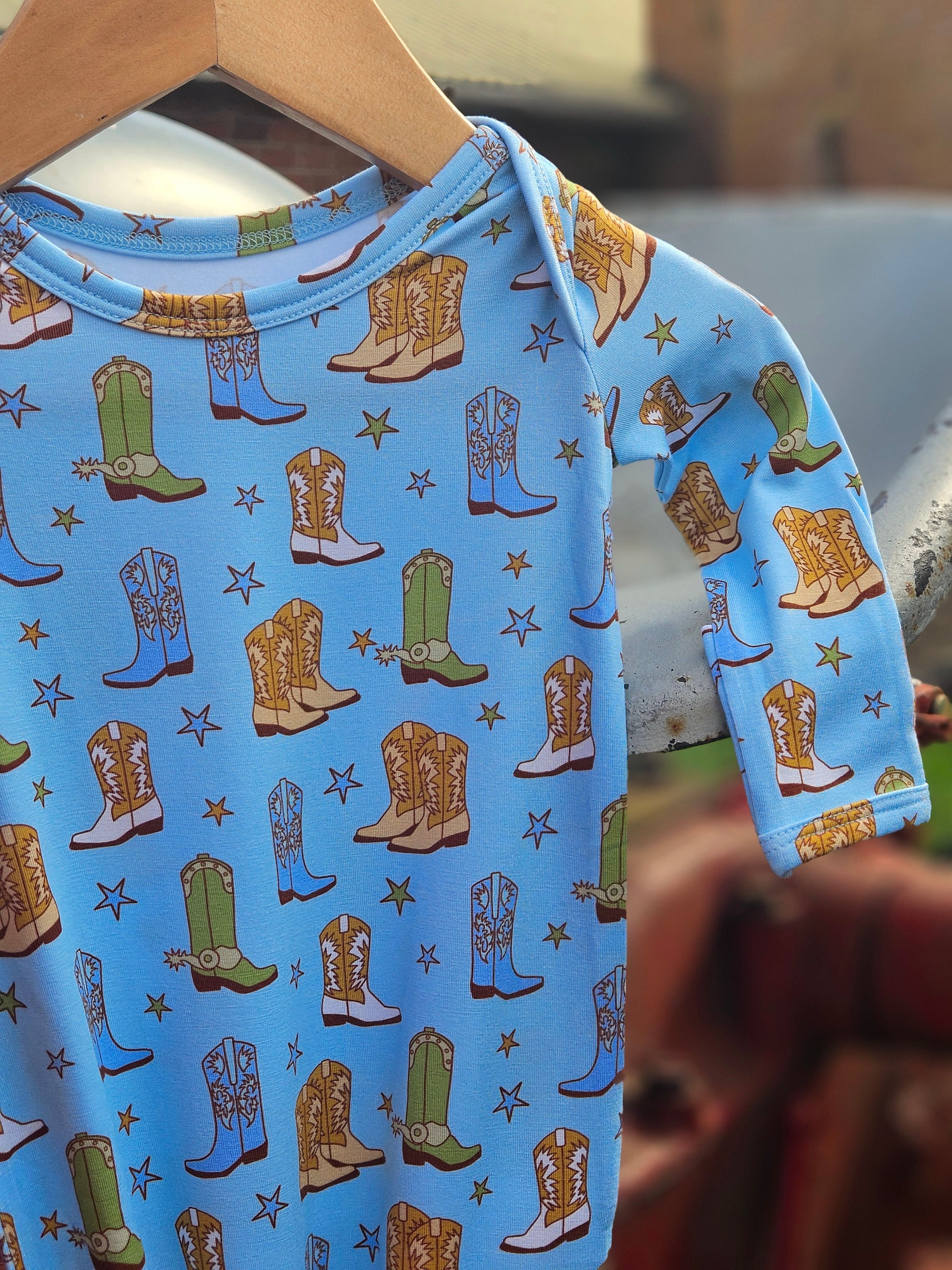 Saddle up in style with our Cowboy Boots & Stars Knotted Gown! Snuggle up in this cozy gown, perfect for your little wrangler. With its knotted design and soft material, your baby will be comfortable and cute all day (or night) long! Yeehaw!