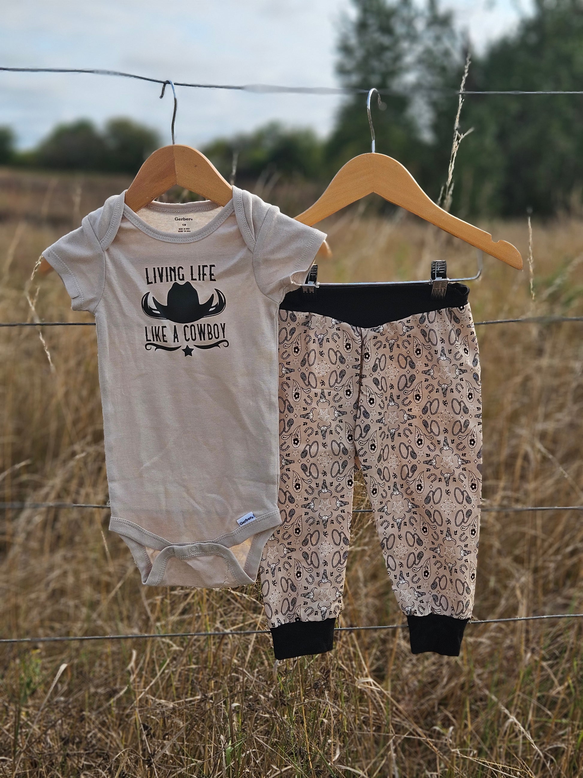 Get ready to kick up some dust in the Livin Life Like a Cowboy Jogger Set! Featuring a fun western print, this comfy outfit is perfect for little cowpokes who love to roam free. Soft fabric and a relaxed fit make it great for playtime and naps alike. Let your child live their best cowboy life in style and comfort!